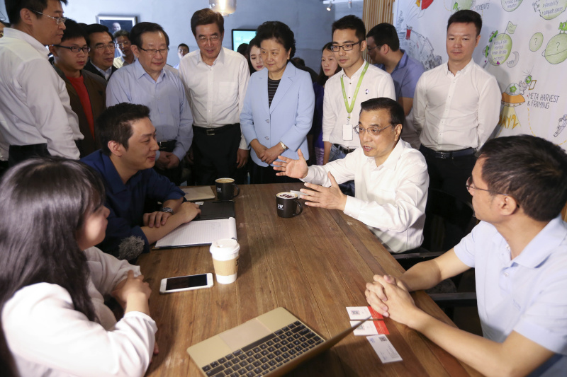 2015年5月7日,李克強來到中關村創業大街3W咖啡。他坐下來與年輕人邊喝咖啡邊聊創業。蜂擁圍攏過來的創業者爭搶著向總理介紹各自的項目。聽到大家各種奇思妙想的創意,總理感嘆道:“這里精彩紛呈,什么想法都有!真正知道社會需求的是大眾,這正是大眾創業的精髓所在。”(資料圖)