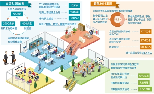 截至2016年底,眾創空間已實現對全國所有省份的全覆蓋,其中民營企業建立的眾創空間占到總數的65.8%,其他為國有企業、事業、社團、民辦非企業、外資及合資等性質。眾創空間提供開放式創業工位77.7萬個,當年服務的創業團隊和創業企業27.4萬個,吸納就業99.4萬人,其中應屆大學生30.4萬人。