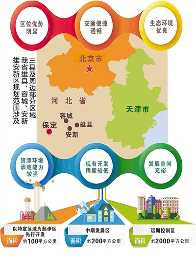 雄安新區規劃范圍涉及河北省雄縣、容城、安新3縣及周邊部分區域,地處北京、天津、保定腹地,區位優勢明顯、交通便捷通暢、生態環境優良、資源環境承載能力較強,現有開發程度較低,發展空間充裕,具備高起點高標準開發建設的基本條件。雄安新區規劃建設以特定區域為起步區先行開發,起步區面積約100平方公里,中期發展區面積約200平方公里,遠期控制區面積約2000平方公里