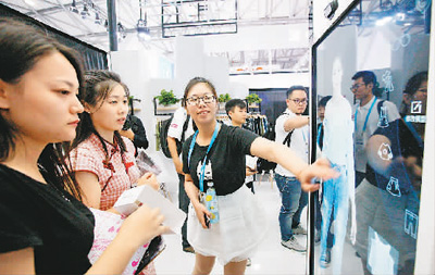 在上海2017年亞洲消費電子展上,參觀者在體驗一款可與電商平臺網絡連接實現試穿下單一體化的智能穿衣鏡。新華社記者方喆攝