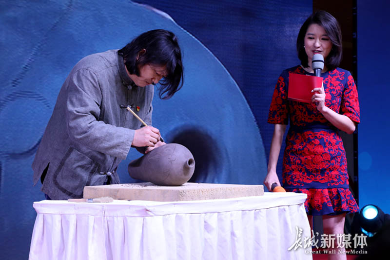 河北曲陽定瓷傳承人龐永輝現場展示陶坯刻花技藝。記者高琳哲攝