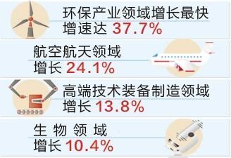七大領域“六升一降”。在全省高新技術產業七大領域中,環保產業領域增長快,增速達37.7%,高于高新技術產業增加值增速27.7個百分點;航空航天領域增長24.1%;高端技術裝備制造領域增長13.8%;生物領域增長10.4%;電子信息領域增長9.6%;新材料領域增長8.3%;新能源領域下降3.3%。