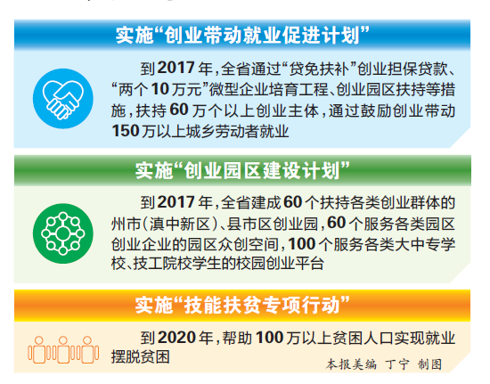 到2017年,全省建成60個扶持各類創業群體的州市(滇中新區)、縣市區創業園,60個服務各類園區創業企業的園區眾創空間,100個服務各類大中專學校、技工院校學生的校園創業平臺