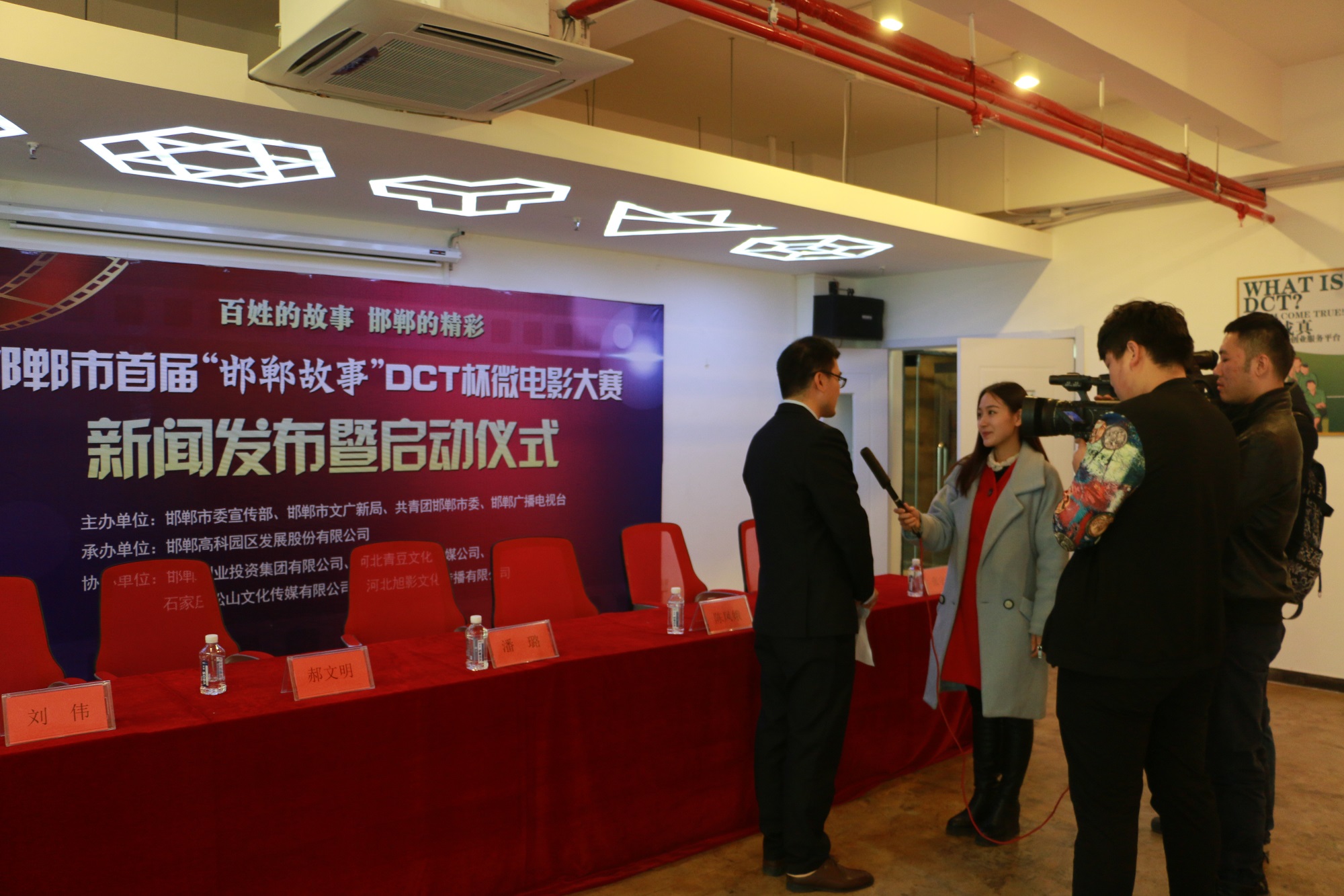 由邯鄲市委宣傳部、邯鄲市文廣新局、共青團邯鄲市委、邯鄲廣播電視臺主辦,邯鄲高科園區(qū)發(fā)展股份有限公司承辦,邯鄲創(chuàng)業(yè)投資集團有限公司、河北青豆文化傳媒公司、石家莊松山文化傳媒有限公司、河北旭影文化傳播有限公司協(xié)辦的邯鄲市首屆“邯鄲故事”DCT杯微電影大賽新聞發(fā)布暨啟動儀式,于2016年3月 17日上午在邯鄲高科DCT創(chuàng)客空間會議室圓滿舉行。