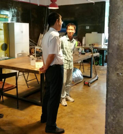 接下來參觀了“90后創(chuàng)客劉詠名”自主研發(fā)的極簡電動滑板車,劉詠名向喬主任介紹了產(chǎn)品的優(yōu)勢并正在積極申請專利,同時表示自己在DCT創(chuàng)客空間內(nèi),享受到了很全面的孵化服務(wù),并對未來的發(fā)展非常憧憬。喬主任表示非常欣慰,同時也提出了中肯的意見,希望劉詠名可以再接再厲,創(chuàng)造更高的輝煌。